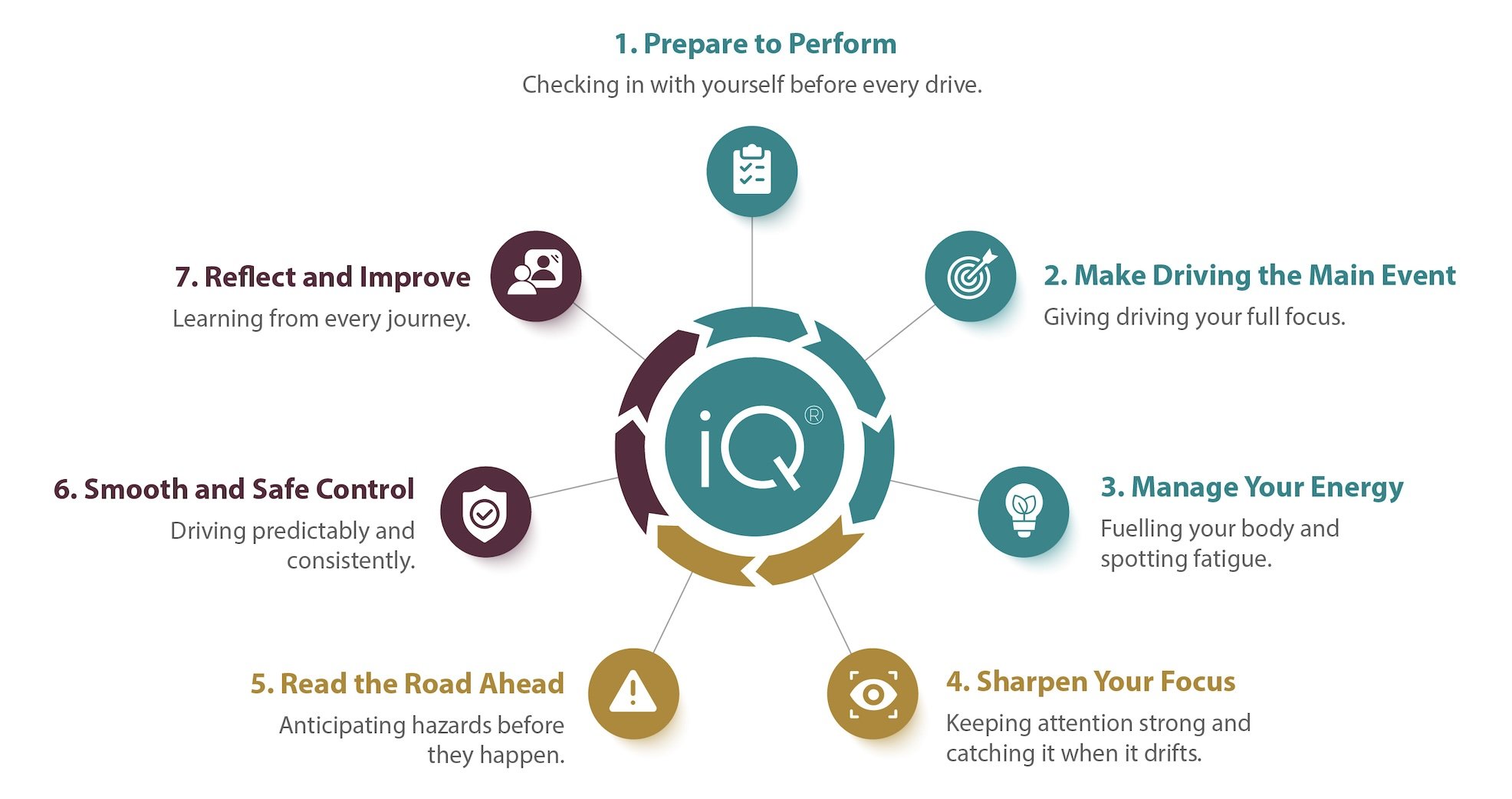 At its heart is the Drive iQ 7-Step Framework, a proven process that helps drivers anticipate risk, manage pressure, and make smoother decisions on every journey.